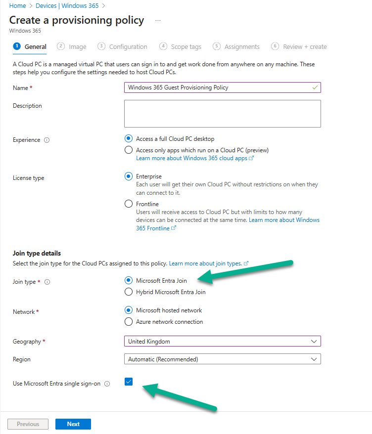 Next, you’ll need to configure a policy (targeted to users) which enables the feature for Cloud PC’s that meet the minimum requirements. To do that select the Windows 365 node in Intune, click Settings and select Create to create the policy. Select Cloud PC configurations (preview) from the options presented.