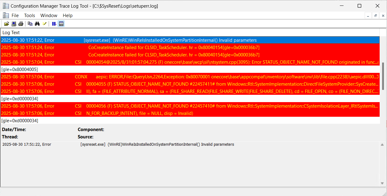 After failing a reset, you’ll see lots of errors in the Setuperr.log located in C:\$Sysreset\Logs\setuperr.log
