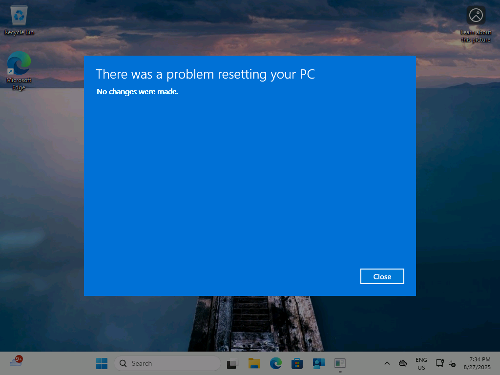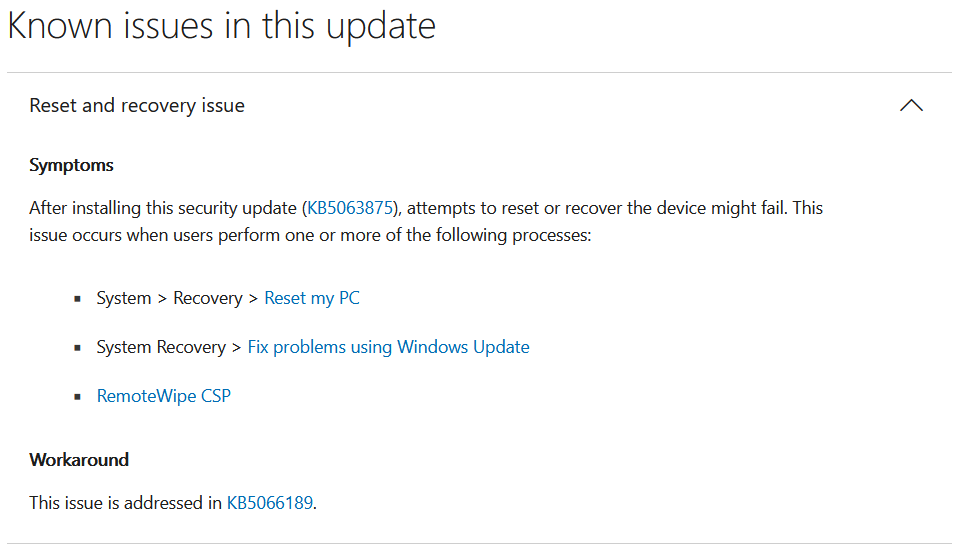 As a result of this update, Microsoft themselves warn against using the built-in Reset and Recovery feature as after installing KB5063875.