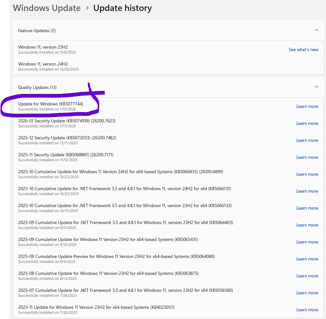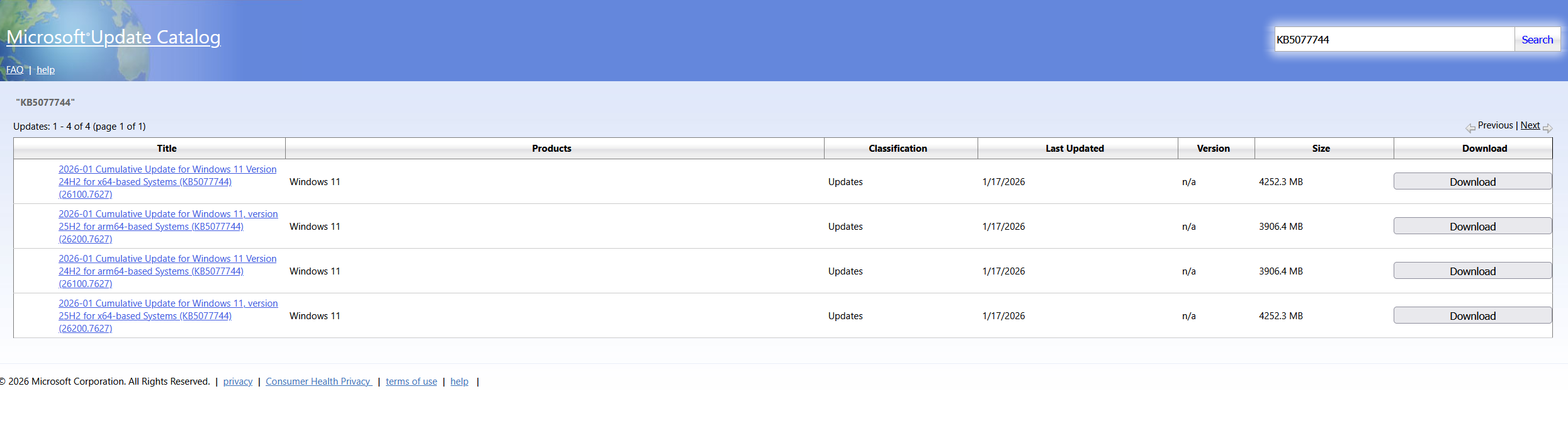 - KB5077744 – https://support.microsoft.com/en-us/topic/january-17-2026-kb5077744-os-builds-26200-7627-and-26100-7627-out-of-band-27015658-9686-4467-ab5f-d713b617e3e4#id0ejbd=catalog