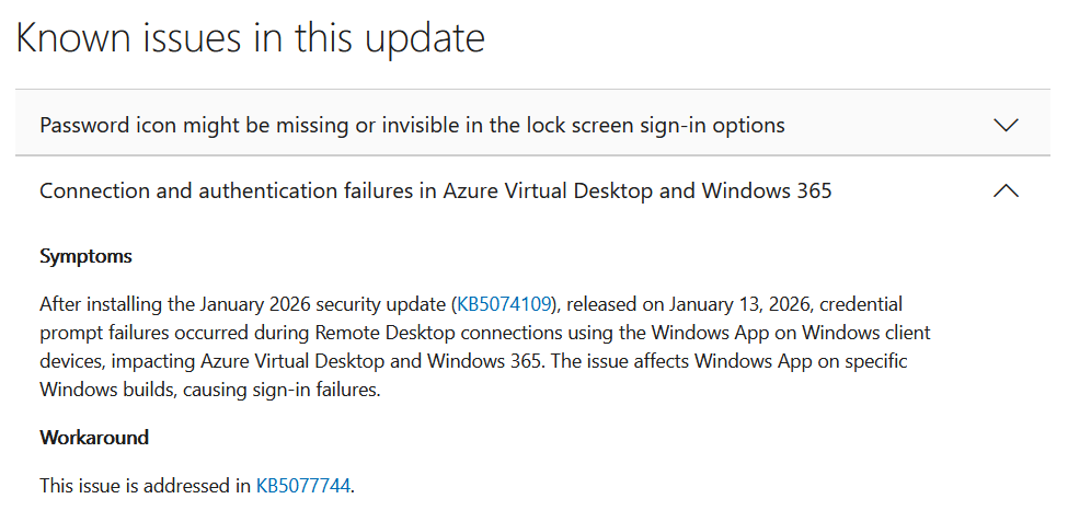 January 2026 security patches (notably KB5074109) are currently breaking logins in the Windows App and Remote Desktop authentication:
