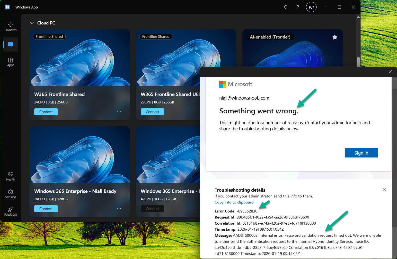 I started my day as always and launched the Windows app, I clicked my Cloud PC, entered my credentials and after a short delay I got an error shown below.