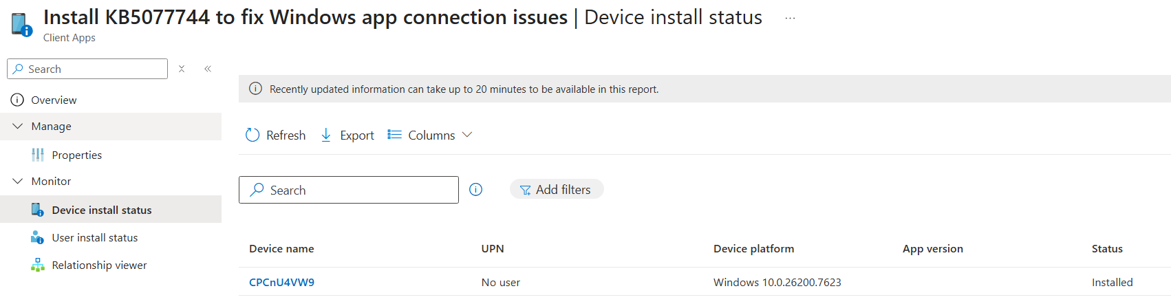 and of course, via Intune, however Intune still has not yet updated the build number of the CPC yet in the Win32 app install status.